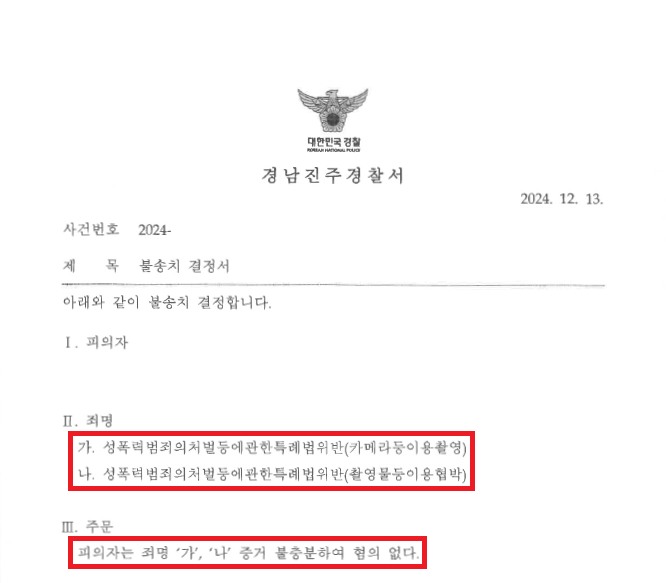 ⑦ 경찰 조사를 받은 후 "A씨는 B씨에게 옷을 벗고 용서를 구하라고 시킨 것은 맞지만, 그 이후에 B씨가 주장하는 바와 같이 그 모습을 몰래 촬영하고 촬영물을 주변 사람들에게 유포하겠다고 협박한 사실은 전혀 없다. 다만, A씨는 B씨가 옷을 벗고 용서를 구하는 사이 손에 들고 있던 핸드폰을 보았고, 그러면서 핸드폰이 B씨를 향한 사실은 있으나, 급하게 확인할 내용이 있어 핸드폰을 본 것일 뿐 B씨를 촬영할 의도는 전혀 없었고, 디지털포렌식 결과 이 사건과 관련한 어떠한 촬영물도 발견되지 않았으므로, 카메라등이용촬영죄와 카메라등이용촬영죄를 전제로 한 촬영물등이용협박죄 모두 성립하지 않는다."라는 내용의 변호인의견서를 작성하여 제출하였습니다.