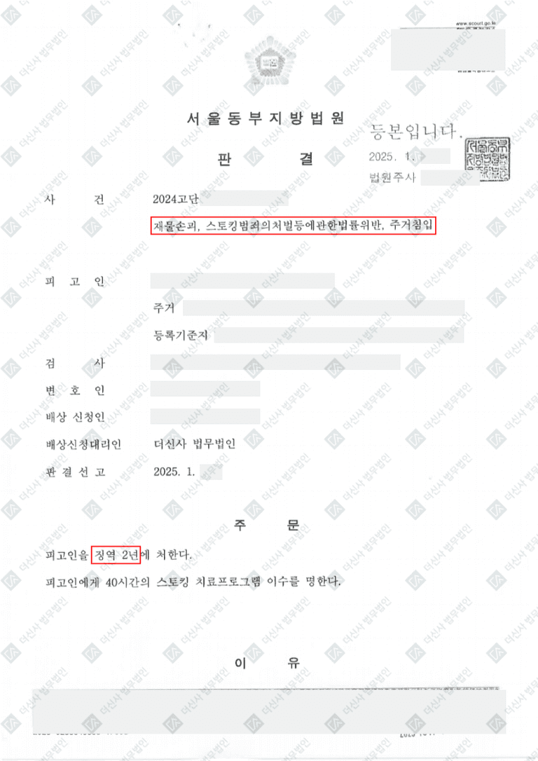 의뢰인이 저희를 찾아왔을 때는 의뢰인이 가해자로 당한 피해로 부터 힘들어 하고 있던 상황이었기에 의뢰인의 정신적인 감정까지 함께 케어하며 앞으로의 진행을 논의하였습니다. 특히 과거 연인이었던 사람으로 받은 피해가 막심하였기에 상대방에 대한 엄벌이 반드시 필요한 상황이었습니다. 저희는 탄원서와 의견서를 통해 의뢰인이 받은 피해를 구체적으로 주장하였고, 결국 다행히도 가해자에 대한 징역 2년이라는 성공적인 결과를 얻을 수 있었습니다.