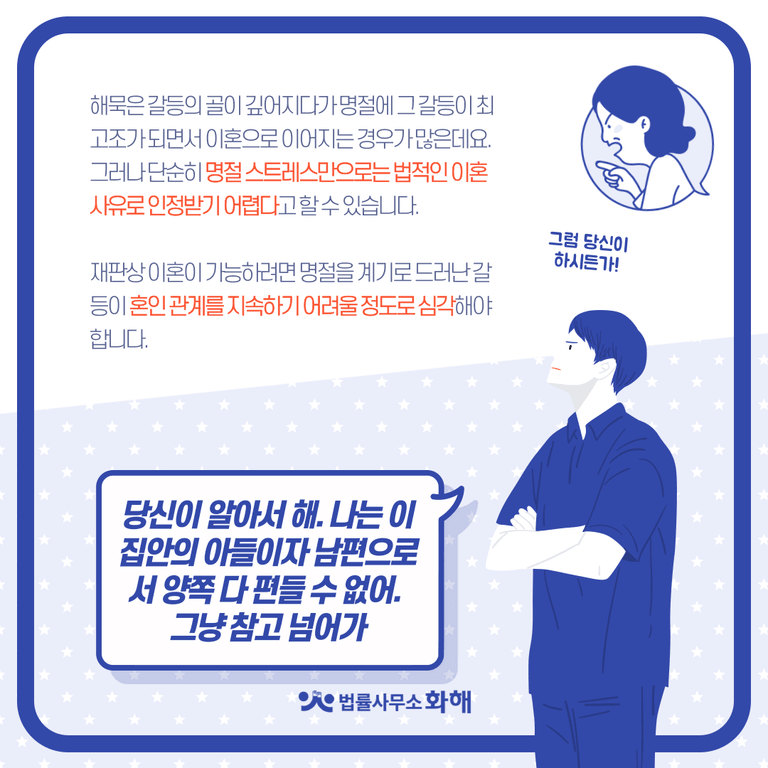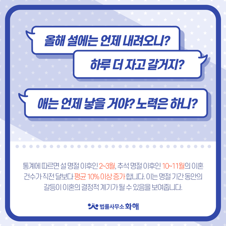 매년 설과 추석 명절이 지나고 나면 저희 법률사무소 화해로 이혼 상담 문의가 눈에 띄게 늘어납니다. 특히 명절 직후 2-3주 동안은 평소와 달리 상담 전화가 쉴 새 없이 울리는데요. "명절 때문에 더는 못 살겠어요", "시댁에 다녀오고 나니 이혼하고 싶어졌어요" 라는 말씀을 정말 자주 듣게 됩니다.