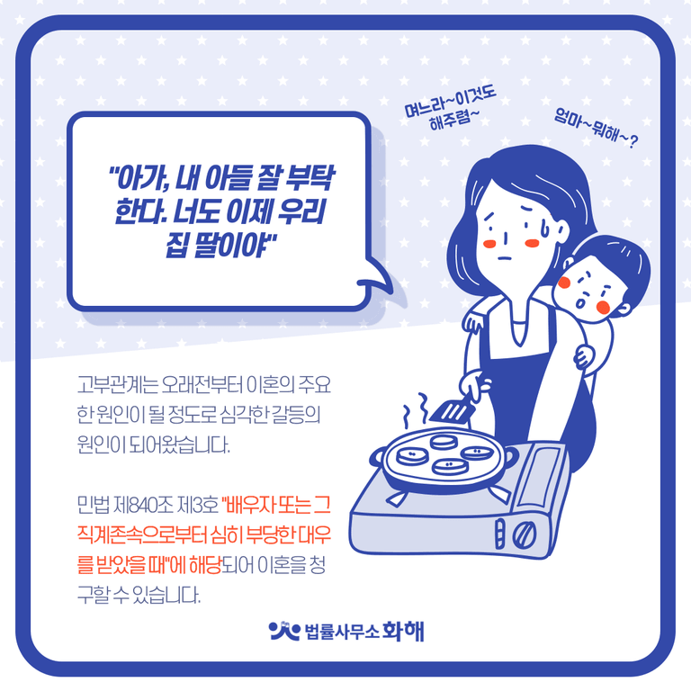 이런 다정한 말씀과는 달리, 현실의 고부관계는 오래전부터 이혼의 주요한 원인이 될 정도로 심각한 갈등의 원인이 되어왔습니다. 실제로 민법 제840조 제3호 "배우자 또는 그 직계존속으로부터 심히 부당한 대우를 받았을 때"에 해당되어 이혼을 청구할 수 있습니다. 그러나 단순한 말다툼이나 명절 잔소리, 가벼운 의견 차이만으로는 부족하며, 지속적이고 심각한 수준의 부당한 대우가 있어야 합니다.