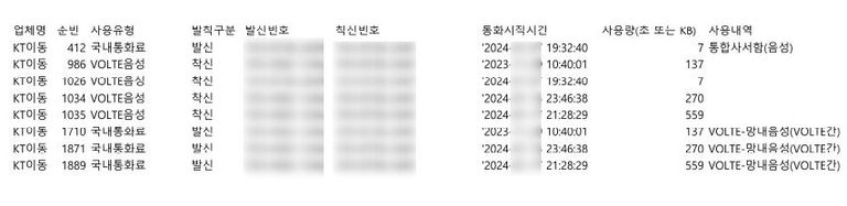 ↳ LG유플러스는 발신 내역과 역발신 내역(수신)을 따로 정리해서 보내주네요.