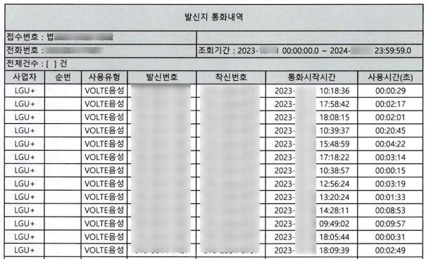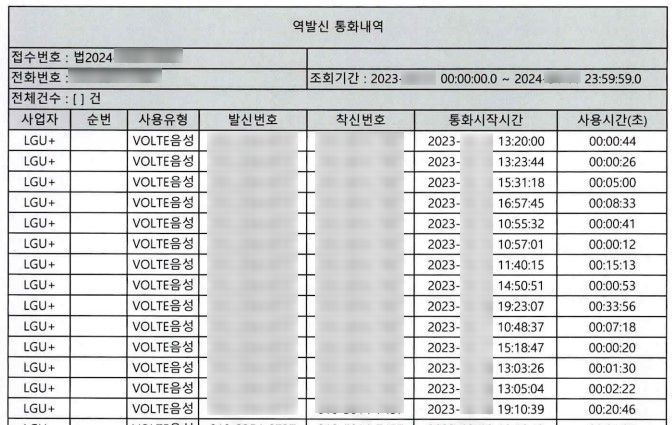 오늘은 실제로 법원에 조회신청(문서제출명령)을 했을 때 각 통신사에서 보내주는 자료가 어떤 것인지 그 실제 자료를 보고 말씀드려볼까 합니다.