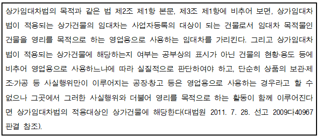 위 사건에서 대법원은 상가임대차법의 적용여부를 좁게 해석한 하급심 판결이 잘못되었다고 판단하였는데, 그동안의 대법원 판례 취지와 크게 다르지 않은 해석이었다고 봅니다.