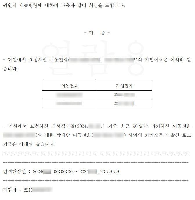 보시다시피 카카오톡은 자신들에게 문서제출명령이 접수된 날을 기준으로 90일 이내의 수발신 기록만 조회해서 알려줍니다.