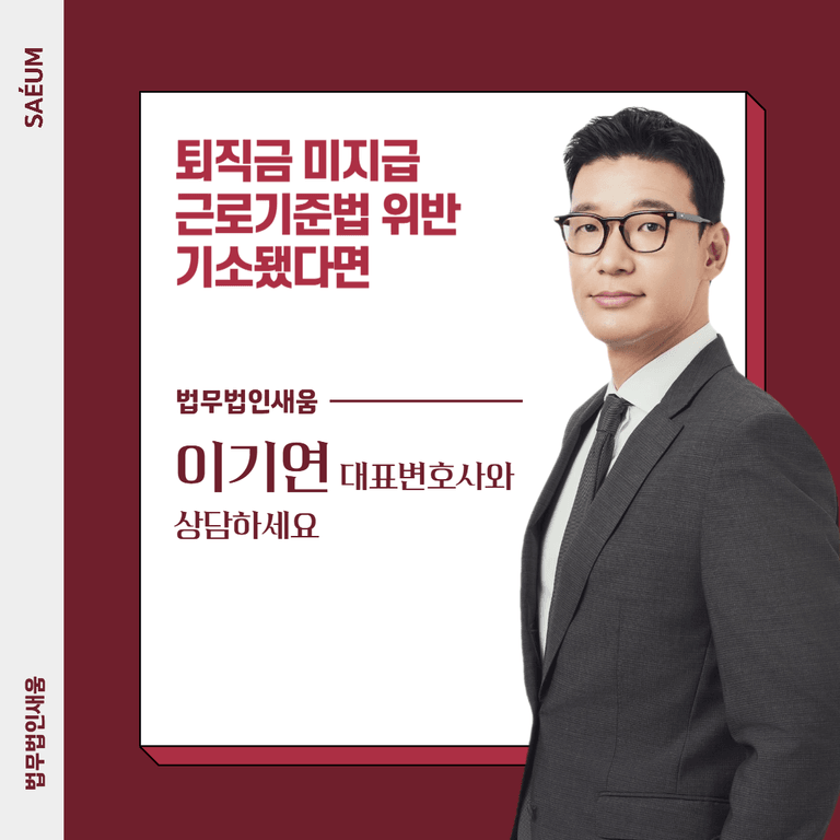 A씨는 상시근로자 수 5인 이상인 자영업을 운영하고 계셨습니다. 문제 없이 운영하고 있던 어느 날 이미 퇴직한 근로자 B씨가 퇴직금을 지급일 연장에 대한 합의 없이 제대로 지급하지 않았다며 퇴직금 미지급과 근무 시간 등에 대한 위반으로 A씨를 고소하게 되었습니다. 이에 따라 처벌을 받을 위기에 처한 A씨는 법무법인 새움을 찾아오시게 되었습니다.