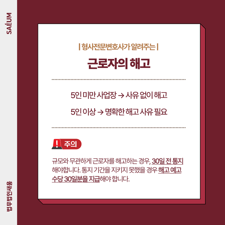 5인 미만 사업장의 경우 정당한 사유가 없어도 해고할 수 있으며, 5인 이상의 경우 사유가 명확해야 해고할 수 있습니다. 규모와 무관하게 해고하게 되었다면 30일 전에 통지해야 하며 통지 기간을 지키지 못했을 경우 해고 예고수당 30일분을 지급해야 합니다.