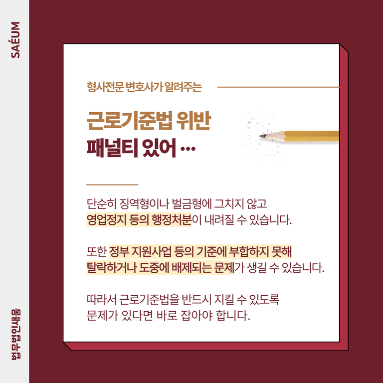 단순히 징역형이나 벌금형에서 그치는 것이 아니라 영업정지 등의 행정처분까지 내려올 수 있습니다. 이렇게 되면 경영에 큰 타격을 주게 되며 이미지 실추 등의 문제를 직면할 수 있습니다. 또한 각종 정부 지원사업 등의 기준에 부합하지 못하게 되면서 탈락하거나 도중에 배제가 되는 등의 문제가 생겨날 수 있습니다. 따라서 근로기준법을 반드시 지킬 수 있도록 해야 하며 근로자와의 오해로 인해 발생한 문제가 있다면 바로잡아 처벌받지 않도록 주의해야 합니다.