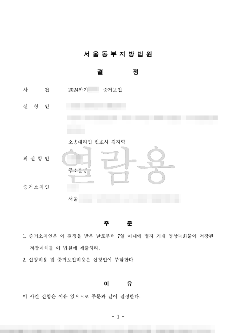 아래는 최근 배우자의 부정행위를 확인할 CCTV 영상에 대하여 증거보전신청하여 결정을 받은 결정문입니다.