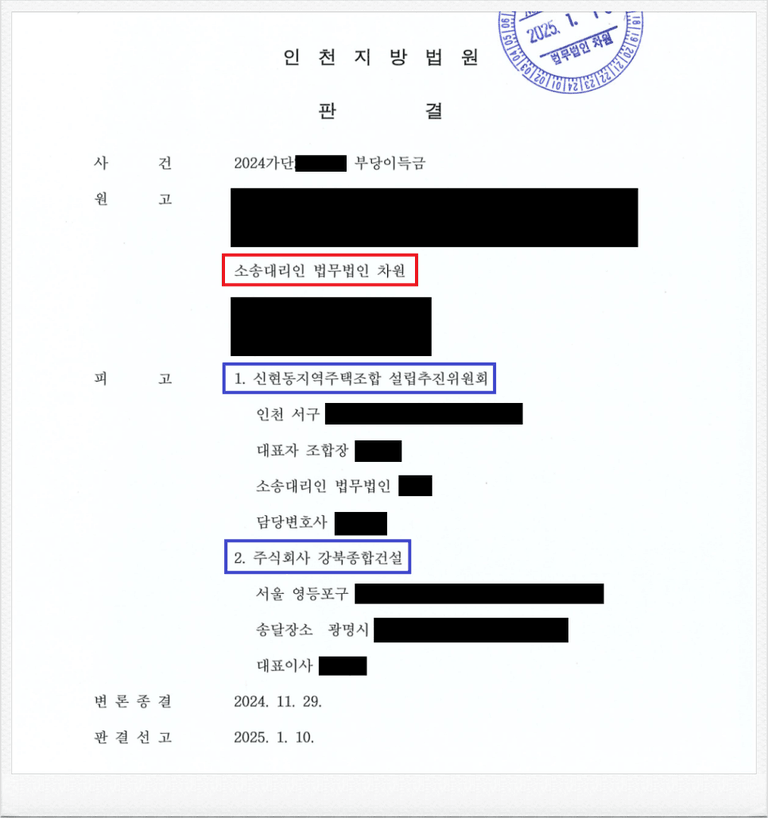 그러나, 가입 후 피고 신현동지역주택조합 설립추진위원회 측이 진행하는 사업이 계획한 대로 진행되지 않았고, 이에 의뢰인은 정식 민사소송을 통하여 기 납입한 금원의 반환을 원하셨습니다.