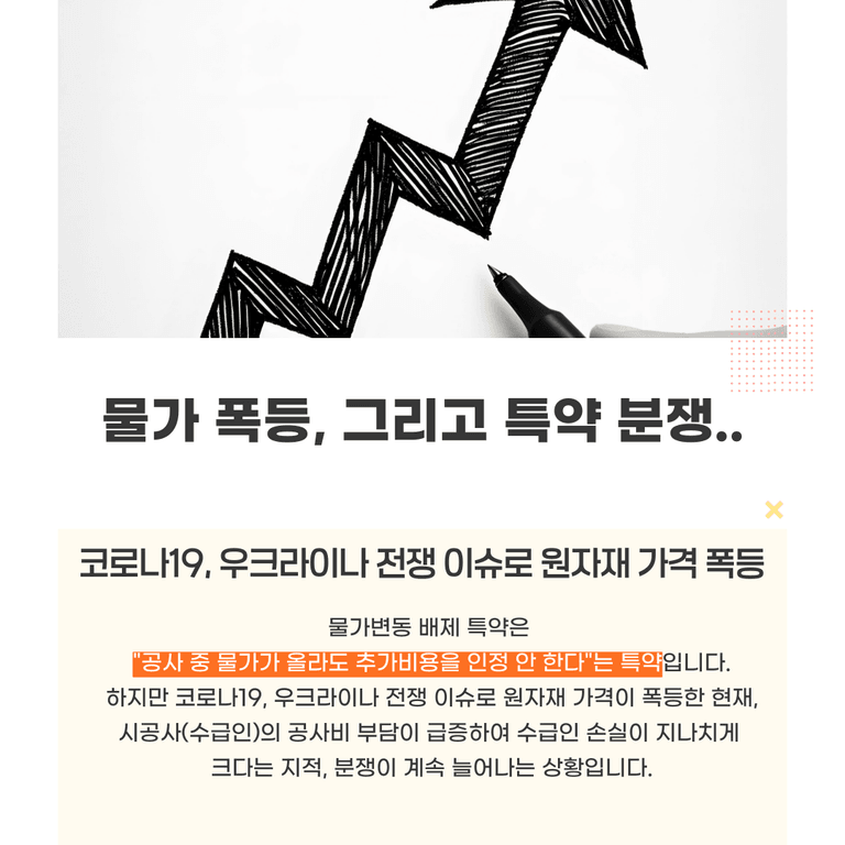 지난 수년간 코로나19 사태와 우크라이나 전쟁 등의 여파로 원자재 가격이 폭등하면서 시공사의 공사 원가 부담이 크게 증가하였다. 2023년 이후 건설공사비지수의 상승률은 다소 둔화되고 있으나, 그동안 폭등한 공사비를 수급인이 전적으로 부담하는 것은 불공정하다는 문제제기가 계속되어 왔으며, 물가폭등기의 손실을 함께 부담해야 한다는 취지의 분쟁 사건들이 꾸준히 증가하고 있는 상황이다.