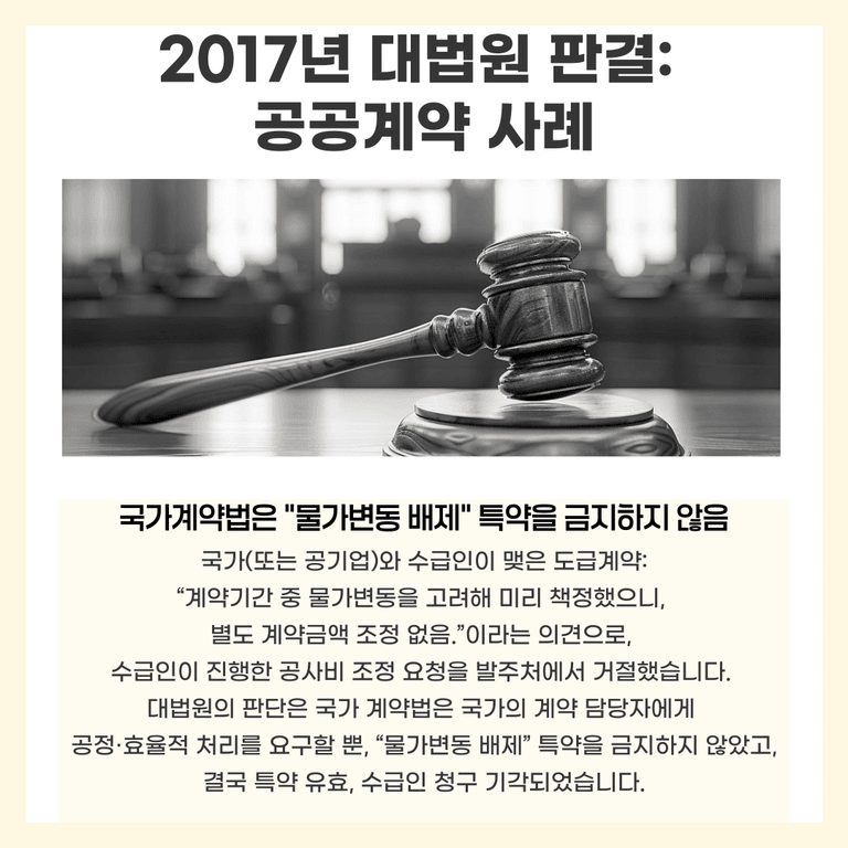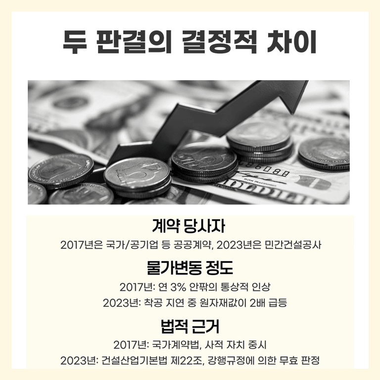 두 판결의 사실관계와 법적 근거는 상당한 차이를 보이고 있다. 2017년 대법원 판결은 국가나 공기업이 당사자인 공공계약에서 연평균 3% 수준의 통상적 물가상승이 있었던 사안이었다. 반면 2023년 부산고등법원 판결은 민간건설공사 도급계약에서 발주자 측의 사정으로 8개월 이상 착공이 지연되고 그 기간 동안 원자재 가격이 2배 가량 급등한 사안이었다는 점에서 큰 차이가 있다.