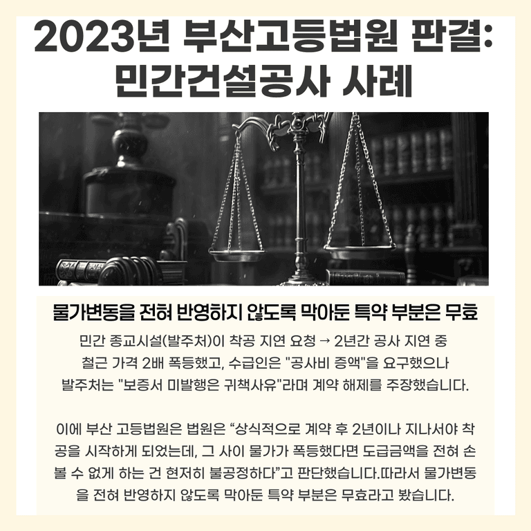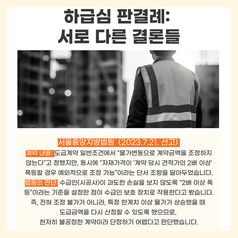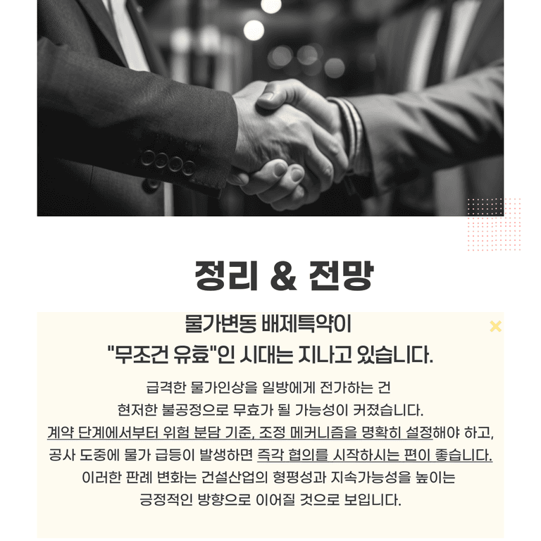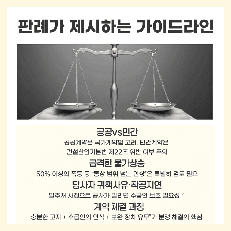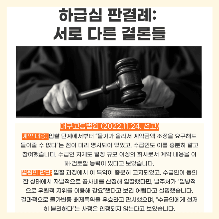 이러한 하급심 판결들은 물가변동 배제특약의 효력을 판단함에 있어 ① 계약 체결 과정에서 물가변동 위험에 대한 충분한 고지가 있었는지, ② 수급인이 이를 감안하여 입찰에 참여하였는지, ③ 급격한 물가변동에 대비한 보완 장치가 마련되어 있는지, ④ 당사자의 협상력에 현저한 불균형이 있었는지 등을 구체적으로 검토하고 있다. 이는 앞서 살펴본 부산고등법원 2023년 판결과 함께 물가변동 배제특약의 효력 판단에 관한 실무상 기준을 제시하는 의미가 있다.