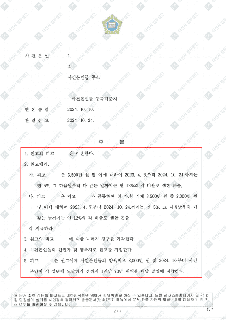 ✔️양육권 및 친권은 원고로 지정하고, 자녀 1인당 70만원씩, 총 140만원을 양육비로 매달 지급하라