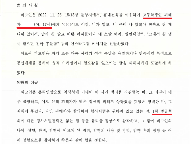 A씨는 2022. 11. 25. 15:13경 인스타그램에서 일면식도 없는 17세 고등학생 B양에게 대뜸 "나 있잖아 진짜로 침 패티쉬 있어서. 남자 침 말고 이쁜 여자들이나 내 스탈 여자. 씹변태임?"이라는 내용의 DM을 전송하였고, B양이 아무런 대답을 하지 않았음에도 재차 B양에게 "그래서 침 냄새 맡으면 진짜 흥분함"이라는 내용의 DM을 전송하였습니다.