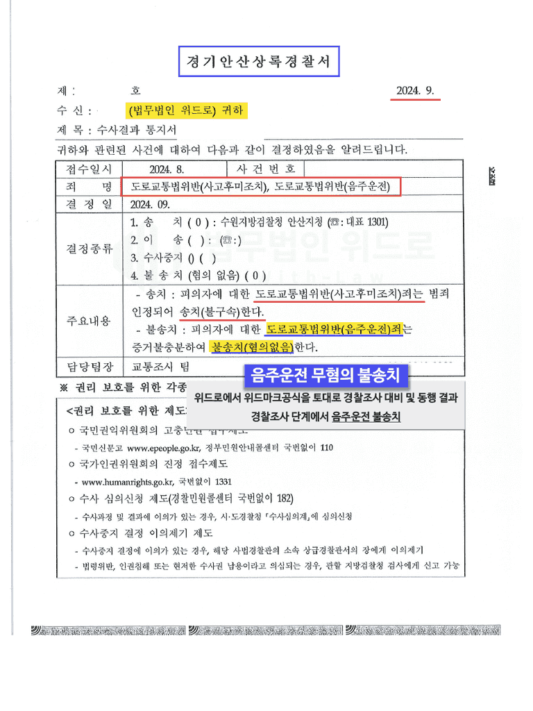 위드로 담당 변호사는 경찰조사에서 위드마크공식을 토대로 의뢰인이 음주수치에 대하여 상세히 진술 할 수 있도록 조력했습니다. 그 결과, 음주운전은 경찰단계에서 혐의없음으로 불송치 결정이 났고, 사고후미조치 사안만 검찰로 송치되었습니다.
