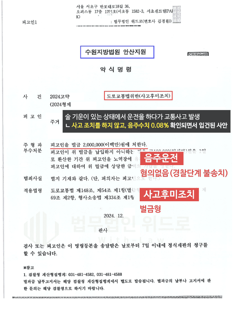 이후 김경환 대표변호사는 의뢰인의 양형자료를 변호인의견서에 상세히 정리하여 제출하였고, 사고후미조치 벌금형 선처로 본 사안은 종결되었습니다.
