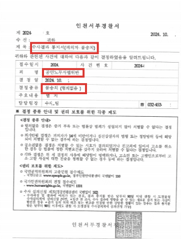 아쉽게도 사건 조사를 담당했던 인천서부경찰서 담당 수사관은 의뢰인의 업무가 공인노무사 고유의 업무라고 판단해 의뢰인에 대해 '검찰송치' 결정을 내렸습니다.