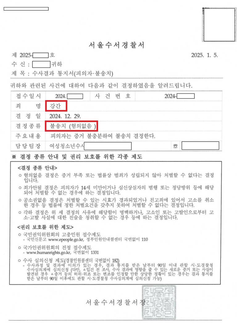 이 사건 담당 수사관은 변호인의 의견을 받아들여 '고소인의 진술에 신빙성이 부족하다'는 판단을 하였고, 의뢰인에 대하여 불송치(혐의없음) 결정을 하였습니다.
