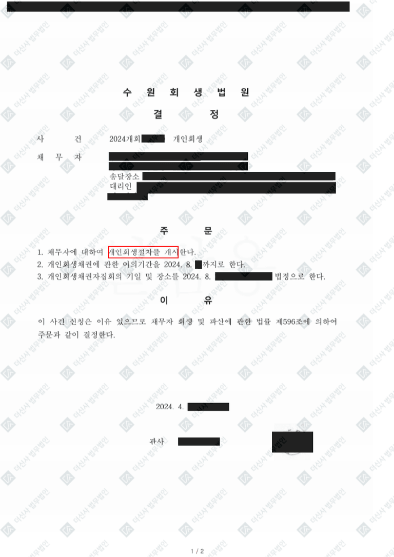 의뢰인은 더신사 법무법인을 통해 개인회생 절차를 맡겼고, 이후 법원의 심사를 거쳐 개인회생 결정이 내려졌습니다. 본 회생 절차를 통해 의뢰인은 채무를 재조정받고, 일정 기간 동안 변제 계획에 맞춰 채무를 이행할 수 있는 기회를 얻었습니다. 법원은 의뢰인의 재정 상황을 고려하여 회생 계획을 승인하였으며, 이를 통해 의뢰인은 기존 채무를 합리적인 범위 내에서 분할 상환할 수 있는 법적 보호를 받게 되었습니다. 회생 절차는 의뢰인의 경제적 회복을 돕기 위한 중요한 첫걸음이 되었습니다.