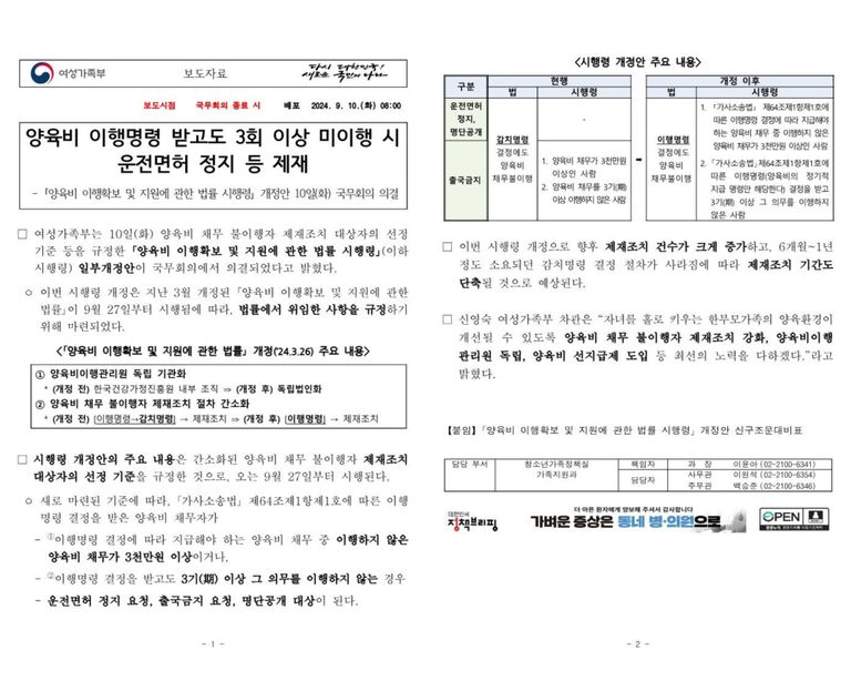 그동안 감치명령 결정까지 비용과 시간이 많이 소요됨에 따라 제재 조치에도 실효성이 떨어져 있었던 것입니다. 이제 양육비 채무자의 양육비 미이행과 관련한 운전면허 정지, 출국금지, 명단공개는 2024. 9. 27.부터는 이행명령 결정을 받으면 위와 같은 조치가 가능해졌습니다.