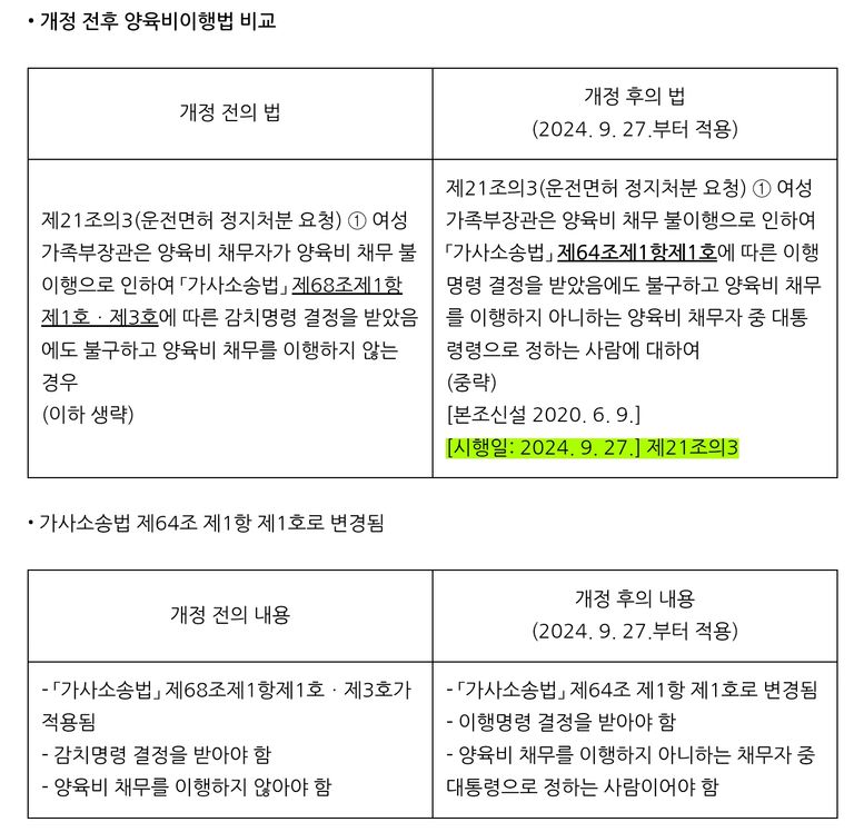 양육비이행법 제21조의3(운전면허 정지처분 요청) ① 여성가족부장관은 양육비 채무자가 양육비 채무 불이행으로 인하여 「가사소송법」 제68조제1항제1호ㆍ제3호에 따른 감치명령 결정을 받았음에도 불구하고 양육비 채무를 이행하지 않는 경우
