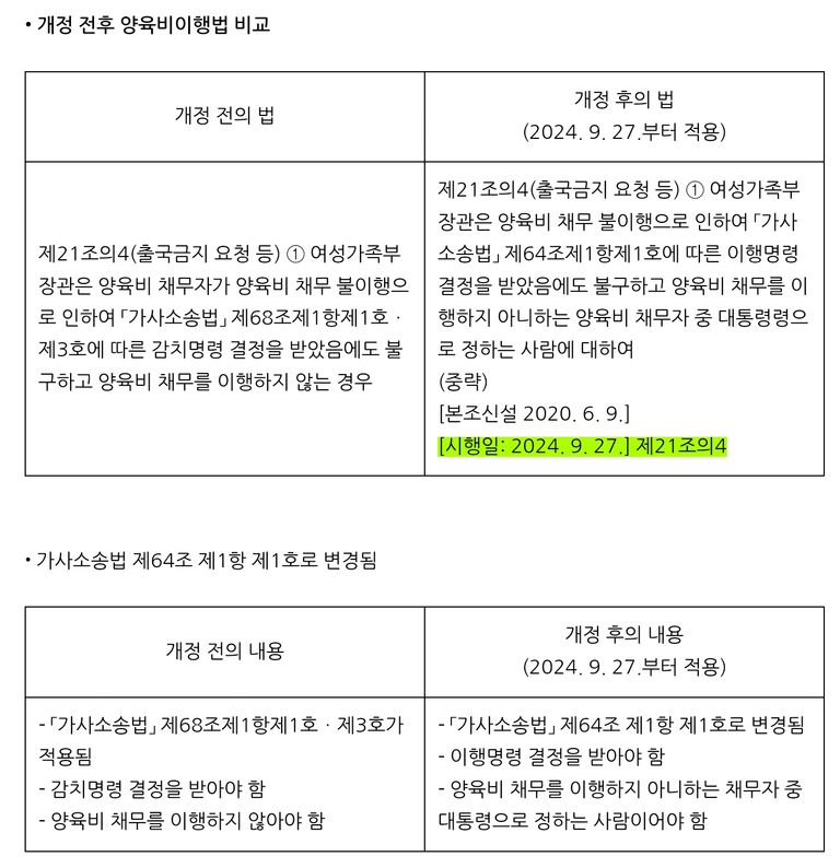 양육비이행법 제21조의4(출국금지 요청 등) ① 여성가족부장관은 양육비 채무 불이행으로 인하여 「가사소송법」 제68조제1항제1호 또는 제3호에 따른 감치명령 결정을 받았음에도 불구하고 양육비 채무를 이행하지 아니하는