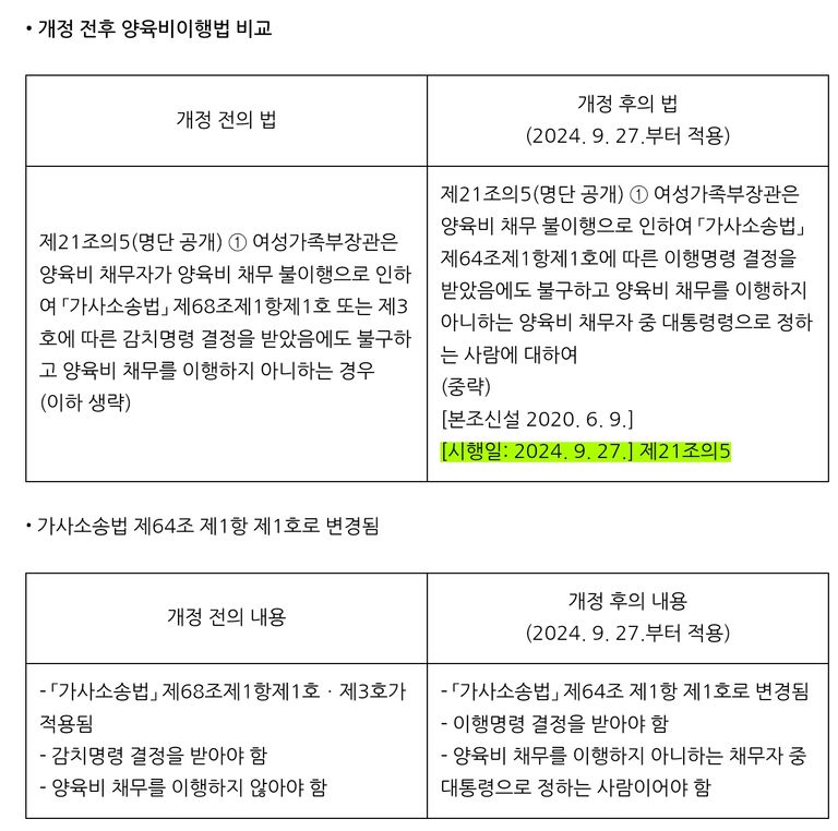 • 개정된 양육비이행법 시행령(대통령령)