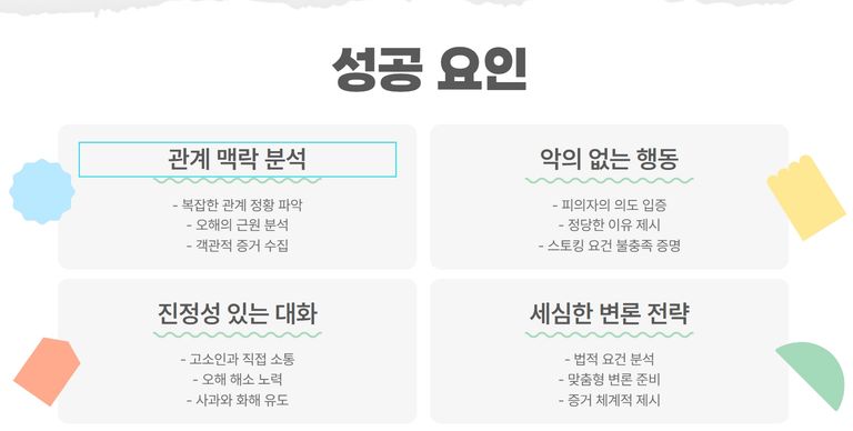 이 사건에서 성공할 수 있었던 주요 요인은 관계의 복잡한 맥락을 정확히 분석하고, 피의자가 악의 없이 행동했음을 설득력 있게 입증한 점입니다. 또한, 고소인과의 진정성 있는 대화를 통해 오해를 풀고 사건을 원만히 마무리한 점도 큰 역할을 했습니다.