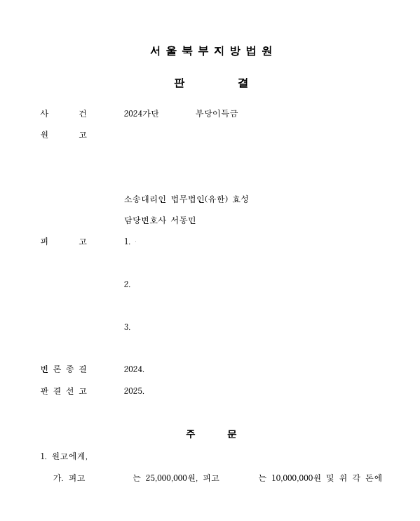 저는 즉각 입금 받은 자들을 피고로 하여 민사소송 부당이득반환청구소송을 제기하였고 법원은 원고 승소 판결을 선고하여 의뢰인은 피해액을 반환받았습니다.