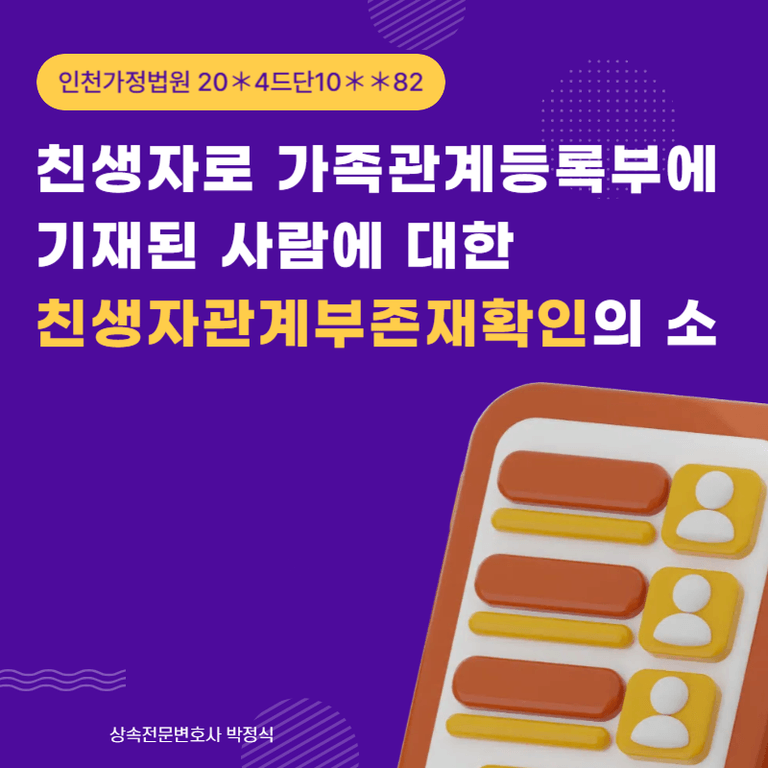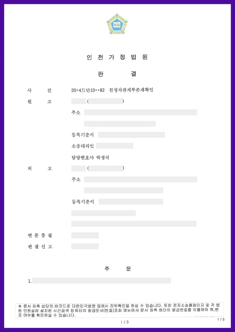 시간이 흘러 망인이 사망하였고, 원고와 교류가 없던 피고는 원고와 피상속인의 재산과 관련하여 상속분쟁을 하게 되었습니다. 원고는 가족관계등록부를 정리하기 위하여, 피고를 상대로 친생자관계부존재확인의 소를 제기하게 되었습니다.