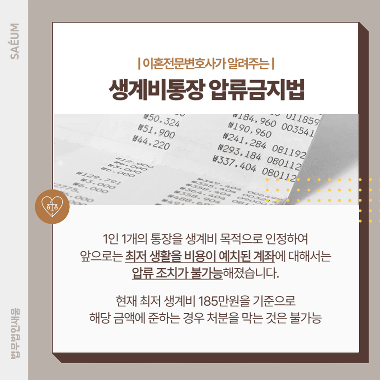 따라서 이러한 일이 생기지 않도록 절혼 소송 초기에 가압류 조치를 해 두는 것이 중요합니다. 그런데 최근 이와 관련하여 반드시 알아두어야 하는 생계비통장 압류금지법이 통과되었습니다.