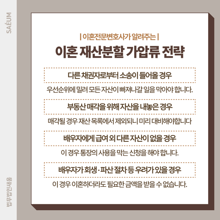 먼저 배우자가 다른 채권자들로부터 소송이 들어왔을 경우입니다. 재판을 통해 이혼이 성립하기 전에 우선순위에 밀려 모든 자산이 빠져나가는 일을 방지해야 합니다.