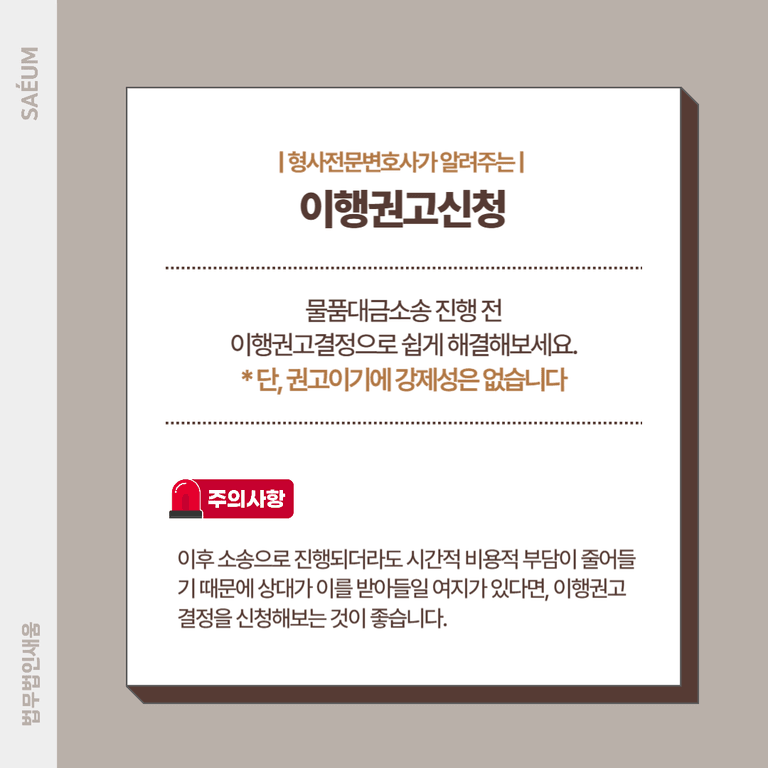번거로움이 적은 것은 물론 시간적, 비용적 부담이 줄어들기 때문에 상대방도 이를 받아들일 만한 여지가 있다면 이행권고결정을 받을 수 있도록 신청하는 과정을 거쳐보는 것이 좋습니다.