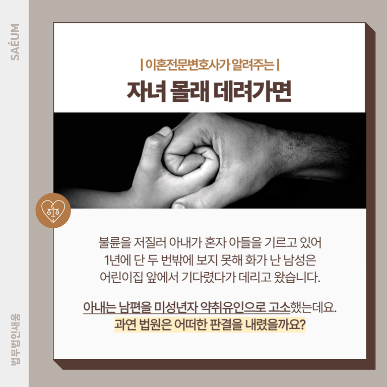 불륜을 저질러 아내가 혼자 아들을 기르고 있어 1년에 두 번밖에 보지 못해서 화가 난 남성은 어린이집 앞에서 기다렸다가 데리고 왔습니다. 아내는 남편을 미성년자 약취유인으로 고소하였는데요. 과연 법원은 어떠한 판결을 내렸을까요?