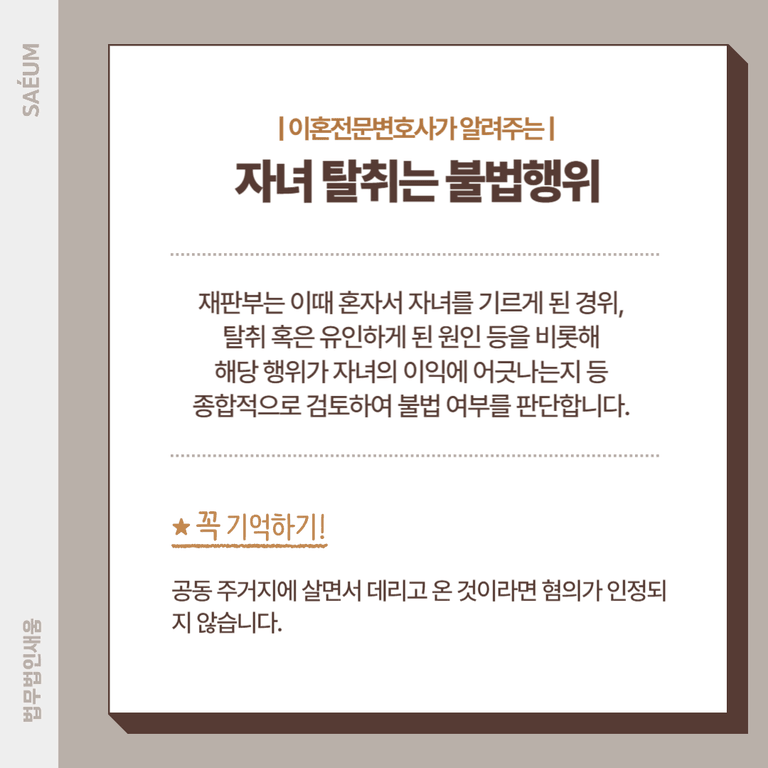 위의 사례를 통해 알 수 있듯이, 만일 상대 배우자와 이혼소송을 진행하는 도중에 아무런 합의 없이 비정상적인 방식으로 아이를 데려갔다면, 책임을 물을 수 있습니다. 재판부는 이때 혼자서 자녀를 기르게 된 경위, 탈취 혹은 유인하게 된 원인 등을 비롯해 해당 행위가 아이의 이익에 어긋나는지 등을 종합적으로 검토하여 판단합니다.