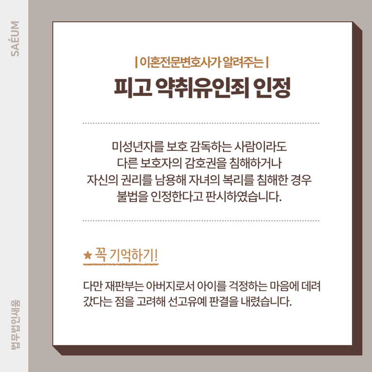 다만 재판부는 아버지로서 아이를 걱정하는 마음에 데려갔다는 점을 고려하여 선고 유예의 판결을 내렸습니다. 참고로 선고 유예란, 선고 자체를 미루어 두었다가 일정한 시간이 지난 후 면소되는 것을 의미합니다. 2년의 시간이 지날 때까지 별다른 문제가 없으면 면소됩니다.