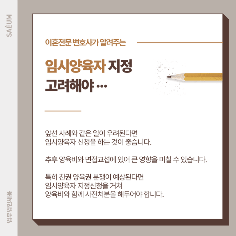 한편 위와 같은 일이 염려된다면 사전에 이혼전문변호사를 통해 임시양육자 신청을 해 두는 것이 좋습니다. 재판 진행 중에 별도의 신청을 통해 임시로 양육자를 지정함을 의미하여 집행력은 없지만, 추후 양육비와 면접 교섭에 있어 중요한 영향을 미칩니다.