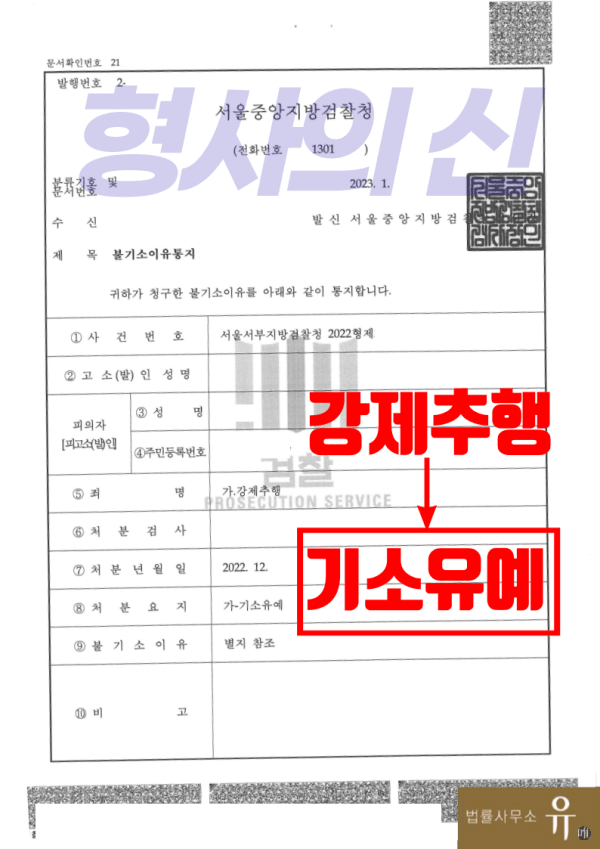 서울서부지방검찰청은 법률사무소 유(唯)의 형사전문변호사가 작성한 변호인의견서의 내용을 받아들여 피의자(의뢰인)가 우발적으로 범행을 저지른 점, 동종 및 이종의 범죄 전력도 없음은 물론 피해자와 원만히 합의를 하고 반성하고 있는 점 등을 이유로 의뢰인에게 기소유예 처분을 하였습니다.