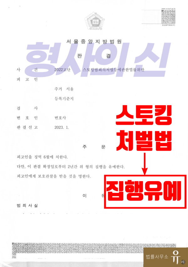 법률사무소 유(唯)의 형사전문변호사는 의뢰인과의 신속한 상담을 통해 사건의 내용 등을 정확히 파악한 후 기존의 잠정조치 위반 행위에도 불구하고 스토킹 행위에 대한 고의나 악의가 아닌 단순히 법에 무지함으로 인한 행위였다는 점과 그럼에도 그간 잘못에 대해 깊고 진지한 반성과 다짐을 하고 있으며, 나아가 피해자와 원만히 합의한 사실 등을 강조한 변호인의견서를 양형자료와 함께 제출하는 한편, 의뢰인의 가족들을 통한 탄원서를 또한 준비하여 법원에 선처를 구하였습니다.