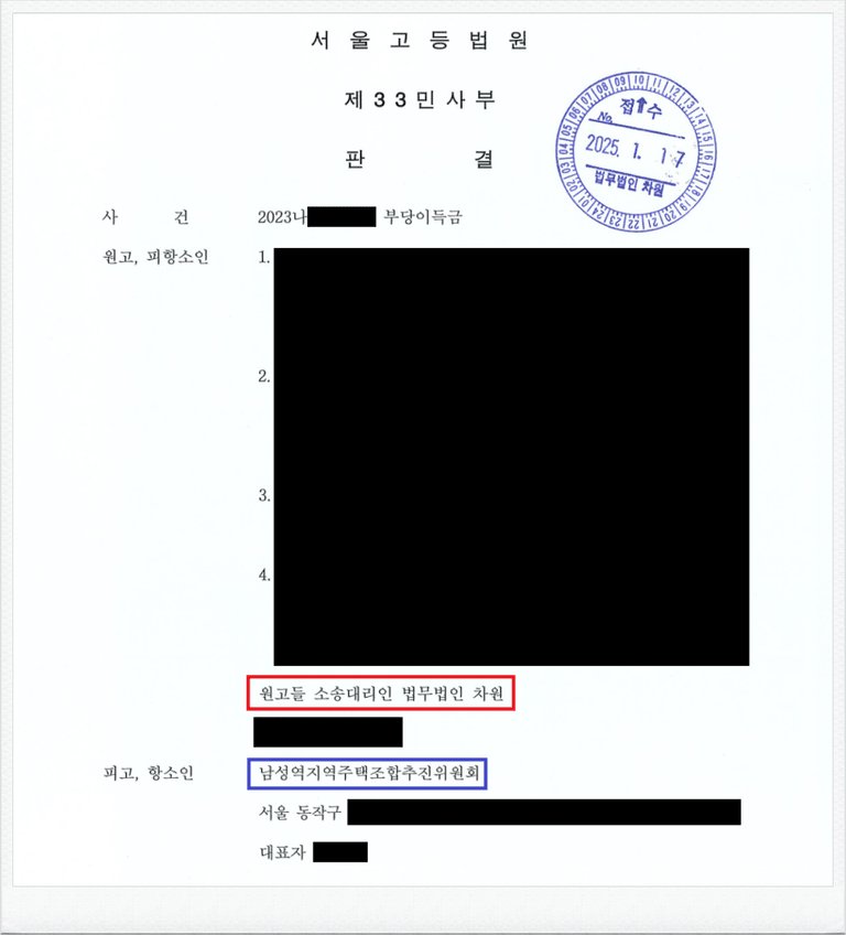그러나 이와 같은 법원의 판결에도 피고 남성역지역주택조합 추진위원회 측은 패소를 인정하지 못하고, 항소하였습니다.