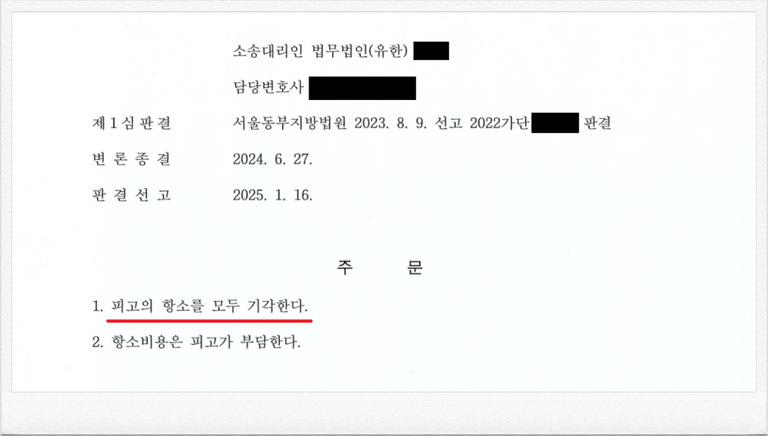이번에도 재판부는 저의 주장을 받아들여, 제1심에서의 사실인정과 판단은 정당한 것으로 인정됨을 그 이유로 하여, 피고 측의 항소를 기각하였습니다.