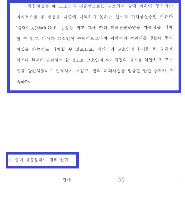 그런 다음 저는 위 자료를 바탕으로, A씨는 이 사건 당시 B양 등과 서로 교환하여 성관계를 하기로 이야기를 나눈 뒤, 성관계를 하게 되었던 것으로 D양, B씨의 진술이 이를 뒷받침하고 있다는 점, B양은 이 사건 당시 술에 만취하였다고 주장하나 당시 술에 만취한 모습이 전혀 없었으며, 의식을 가지고 했던 행동에 대해서 단지 기억을 하지 못하는 '블랙아웃' 증상을 겪고 있는 것으로 보인다는 점, B양은 약 6개월이 지난 시점에 A씨와 사소한 문제로 말다툼을 하게 되자, A씨, C씨를 신고하였다는 점 등을 적극적으로 어필하며 'A씨는 이 사건 당시 B양과 서로 합의하에 성관계를 하였을 뿐, C씨와 합동하여 B양을 강간한 사실이 없다'는 내용의 변호인의견서를 수사기관에 여러 차례 제출하였습니다.