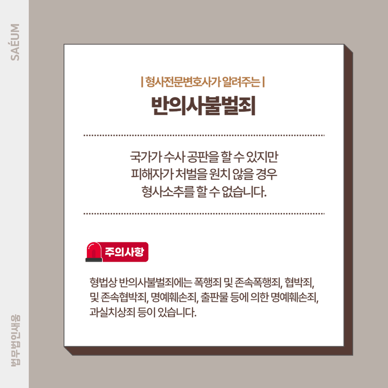 문제는 피해자가 중단 의사를 밝혔다고 하여 수사 중단이 이루어지는 것은 아니라는 점입니다. 기본적으로 모든 형사 범죄가 반의사불벌의 조항이 적용되지 않기 때문입니다.