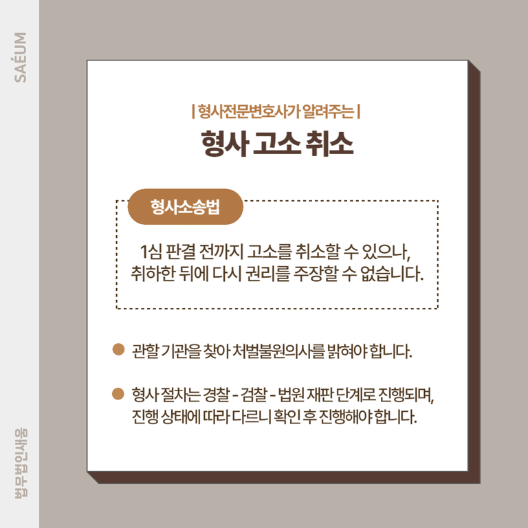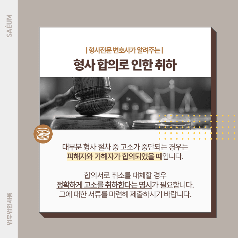 간혹 합의서로 취소를 대체하는 것이 가능한지 질문을 하시는데요. 물론 해당 합의가 중단의 의미가 있기도 하지만, 정확하게 고소를 취하한다는 뜻인지를 명시해 두는 것이 중요하므로, 그에 대한 서류를 마련하여 제출하시기를 바랍니다.