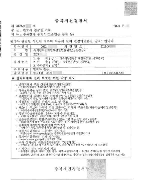 변호인은 위와 같은 조사를 토대로 유리한 증거들과 함께 의견서를 제출하였고, 수사는 약 1년가량 진행되었습니다.