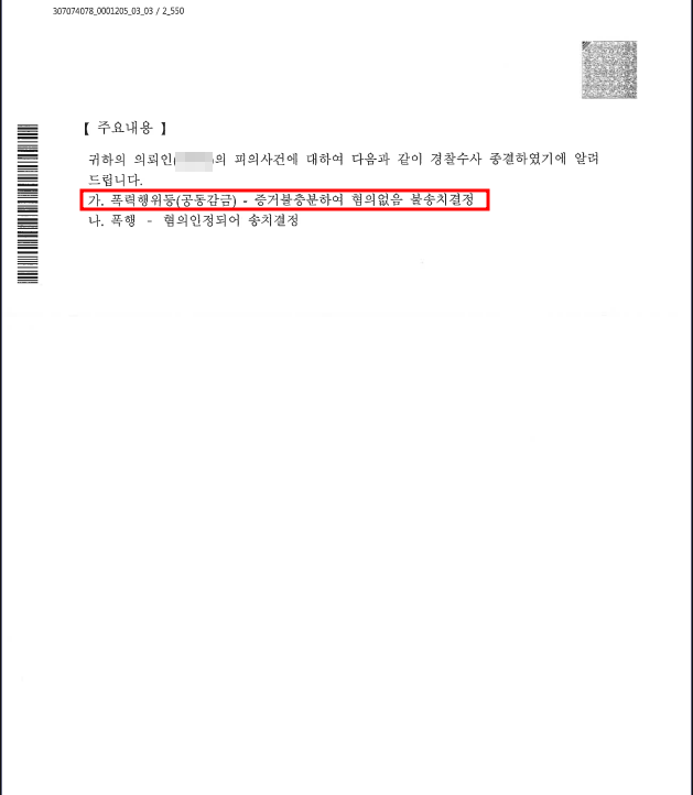 경찰은 변호인의 의견을 받아들이고 의뢰인에게 공동감금에 대하여는 ‘혐의없음(불송치)’ 처분을 하였는바, 의뢰인은 자신의 억울함을 풀 수 있었습니다.