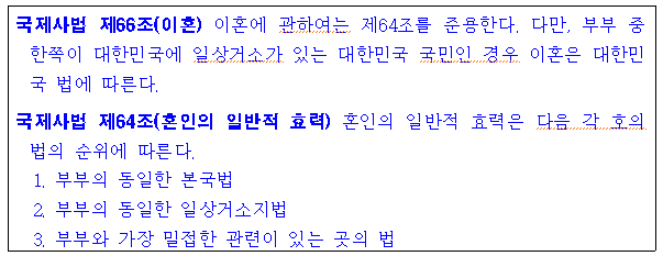 당연하게도 우리나라 법을 적용해 이혼절차가 진행되는 것이 우리나라 사람으로서는 훨씬 편하기 때문에 우리나라 법이 적용될 수 있는 근거를 제시하는 것이 좋습니다.