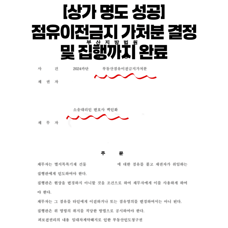 ![[상가 명도 성공]점유이전금지 가처분 결정 및 집행 완료](/_next/image?url=https%3A%2F%2Fd2ai3ajp99ywjy.cloudfront.net%2Fuploads%2Ftitleimage%2Foriginal%2F5c2328f90d2b63a9027beda7-original.jpg&w=3840&q=75)