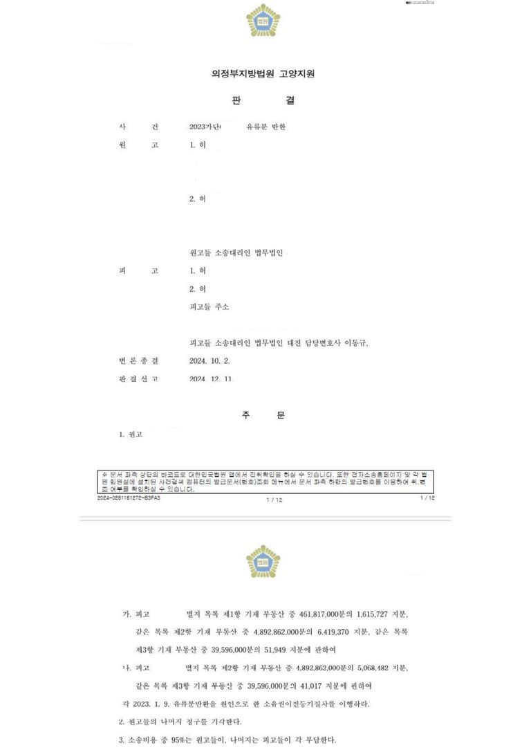 약 10회에 걸친 힘겨운 재판을 통하여 상대방들 그리고 특히 상대방들의 자녀들이 증여받은 재산 또한 상대방들의 특별수익으로 인정받을 수 있었고, 1%도 안되는 지분만 유류분으로 반환하고 나머지는 모두 기각시키는 좋은 결과를 이끌어낼 수 있었습니다. 또한 소송이 종료된 후 소송비용의 95%를 상대방들에게 청구할 수 있었던 완전 승소와 다름없는 쾌거를 이룰 수 있었습니다.