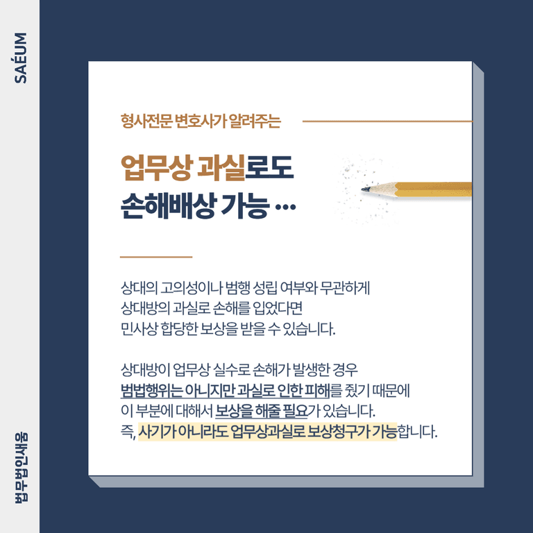 보통 상대방의 불법적인 행위로 인해서 피해를 보게 된 부분만 청구할 수 있다고 생각하시는 분들이 많습니다. 하지만 상대방의 고의성이나 범행 성립 여부와는 무관하게 상대방의 과실로 인해 손해를 입게 되었다면 민사상의 대응을 통해 합당한 보상을 받아볼 수 있습니다.